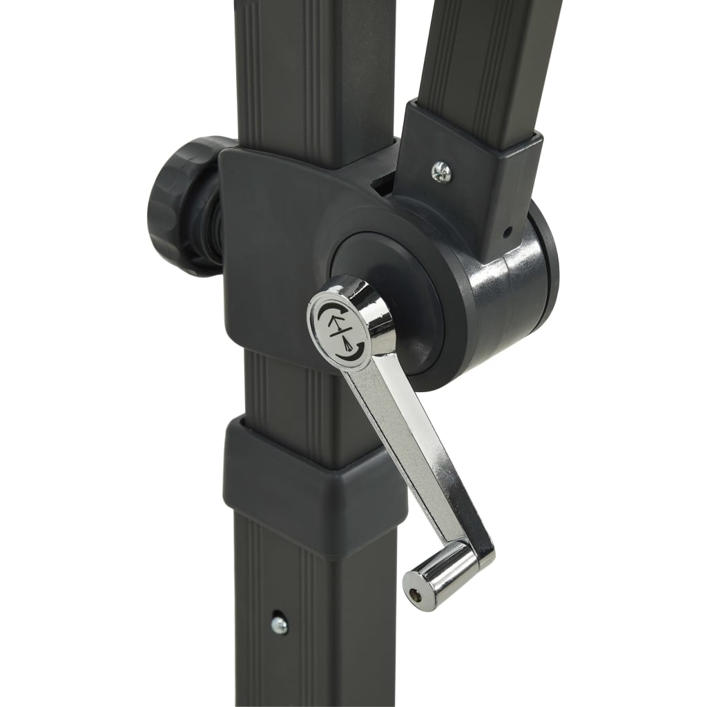 This cantilever garden parasol is perfect to create some shade and protect you from the sun's harmful UV rays. Made of UV protective and anti-fade polyester, the parasol cover provides you with optimum protection against the sun and is easy to clean. It features a sturdy cross base to add stability. The exclusive design of this parasol allows you to tilt and rotate it in 360 degrees to block the sun. The strong aluminium pole, along with the 8 ribs, makes the parasol very stable and durable. This garden umbrella can be easily opened and closed thanks to the crank mechanism. Additionally, the double-top design canopy helps ventilation. Please note that we recommend treating the umbrella fabric with a waterproofing spray if it is subjected to heavy rainfall.