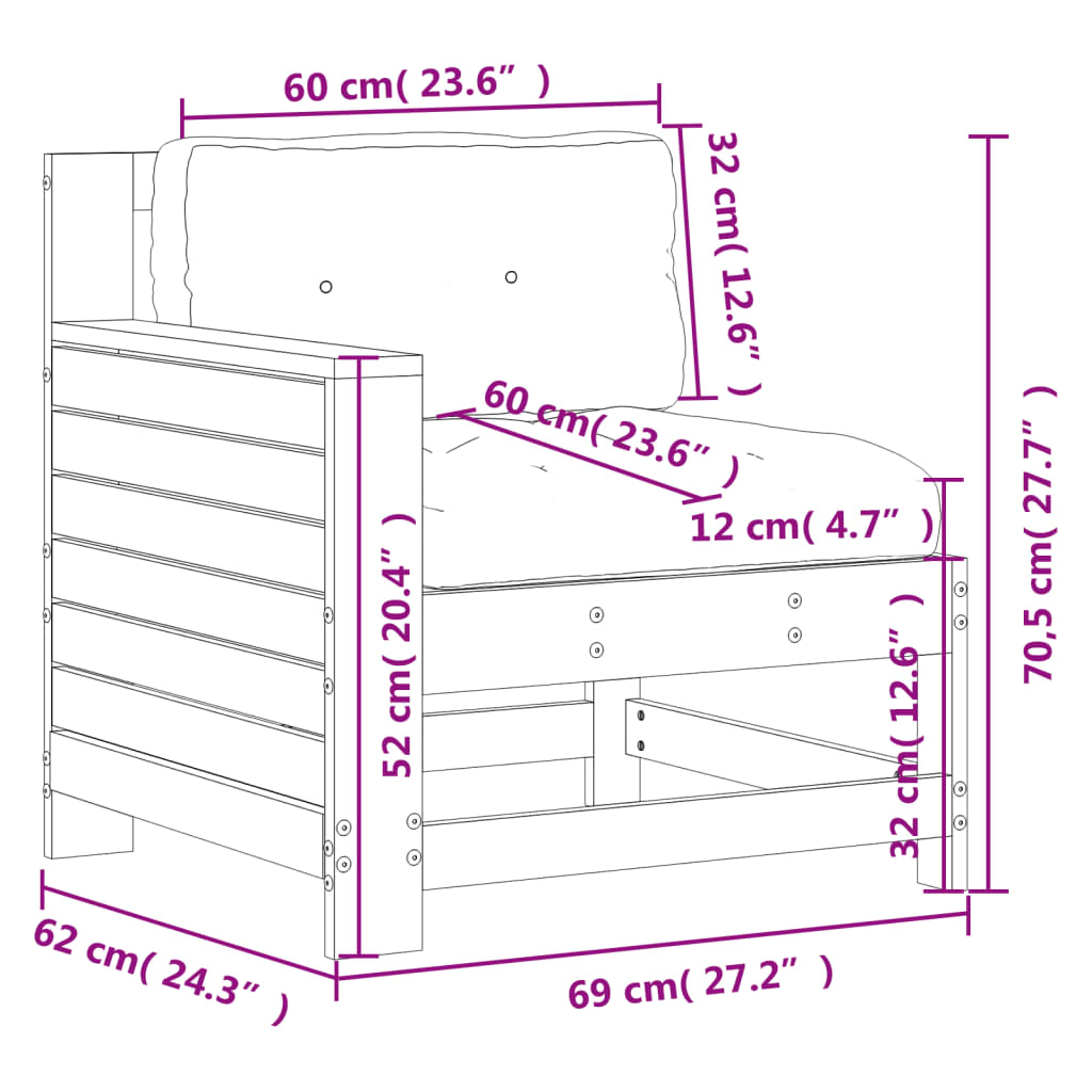 This wooden garden sofa with cushion will make a great addition to your garden, terrace, or patio for chatting with family and friends or just enjoying the weather. Solid pine wood: The garden seating is made of solid pine wood for sturdiness and stability. Solid pine wood is a beautiful natural material. Pine wood has a straight grain, and the knots give the material its signature, rustic look.Comfortable seat experience: The backrest and the cushions make the garden sofa chair more comfortable to sit on.Slatted design: The slatted design of the wooden garden chair prevents water accumulation, keeping the seat dry and preventing unnecessary rotting.Modular design: The sectional sofa is flexible and easy to move around. You can combine it with other modular segments available in the drop-down menu to create your own personal garden lounge set configurations!Wide applications: The garden armchair is perfect for any front porch, patio, backyard, lawn, garden, etc. Good to know:To make sure your outdoor furniture stays beautiful, we recommend protecting it with a waterproof cover.