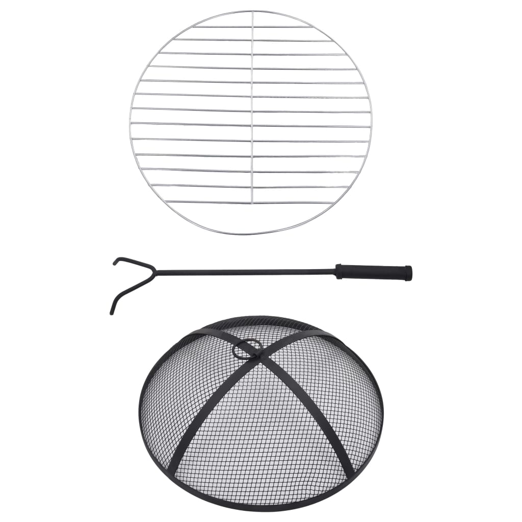 This fire pit will make a decorative and atmospheric addition to your garden or patio decor, while also keeping you warm when it gets colder in the evening. Made of steel, the fire pit bowl is excellent in absorbing and radiating heat. It can be used to burn dry wood, logs or charcoal. The fire pit is supported by a four-leg stand. The included safety mesh allows you to watch the burning fire, and encloses the fire for safety as well as preventing sparks and debris flying out. The poker tool can be used for both removing the mesh cover and rearranging the logs or coal. Additionally, the fire pit table can also be used as a barbecue. Its round ceramic surface offers a perfect place for drinks and roasting supplies. Please note this product is not suitable to be left outside in cold condition.