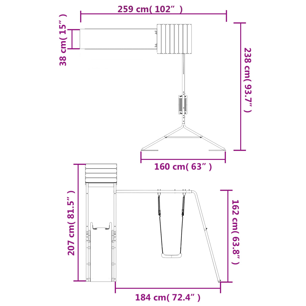 Do you want to give your children the freedom to play at home? This wooden outdoor playset transforms your backyard into a playground for imaginative adventures! Durable material: This playhouse is made of vacuum pressure impregnated pinewood. Solid pine wood is a beautiful natural material. Pine wood has a straight grain, and the knots give the material its signature, rustic look. Impregnation is a preservation process that is carried out by using autoclaves. The pressure-treatment increases resistance to decay and weather. Sturdy and stable frame: The wooden frame ensures sturdiness and stability. In addition, the "A" shaped legs of the children's swing allow for balance. Multi-activity centres: The climbing frame features a 90 cm height platform and stands out with its wave slide, a single swing set as well as a sandpit. Your little ones can also invite their friends to join the fun. Thoughtful design: The surrounding wooden railings are designed to ensure the safety of children during their happy play. Also, the wooden roof provides shade for your children on hot summer days. Endless fun: This fun-filled wooden outdoor playhouse is the perfect way for your child and their friends to enjoy entertainment, have more interactive time and make memories for you and your children! Warning:Only for domestic useOutdoor use Not suitable for children under 3 years Recommend user age: 3-8 years old Good to know:To make assembly as easy as possible, each product is delivered with a manual.